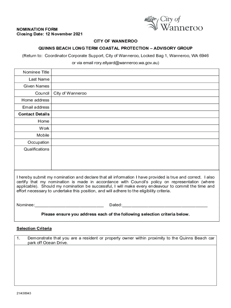 NOMINATION FORM Closing Date: 12 November 2021 CITY OF WANNEROO QUINN BEACH LONG TERM COASTAL PROTECTION ADVISORY GROUP (Return to: Coordinator Corporate Support, City of Tanneries, Locked Bag 1,