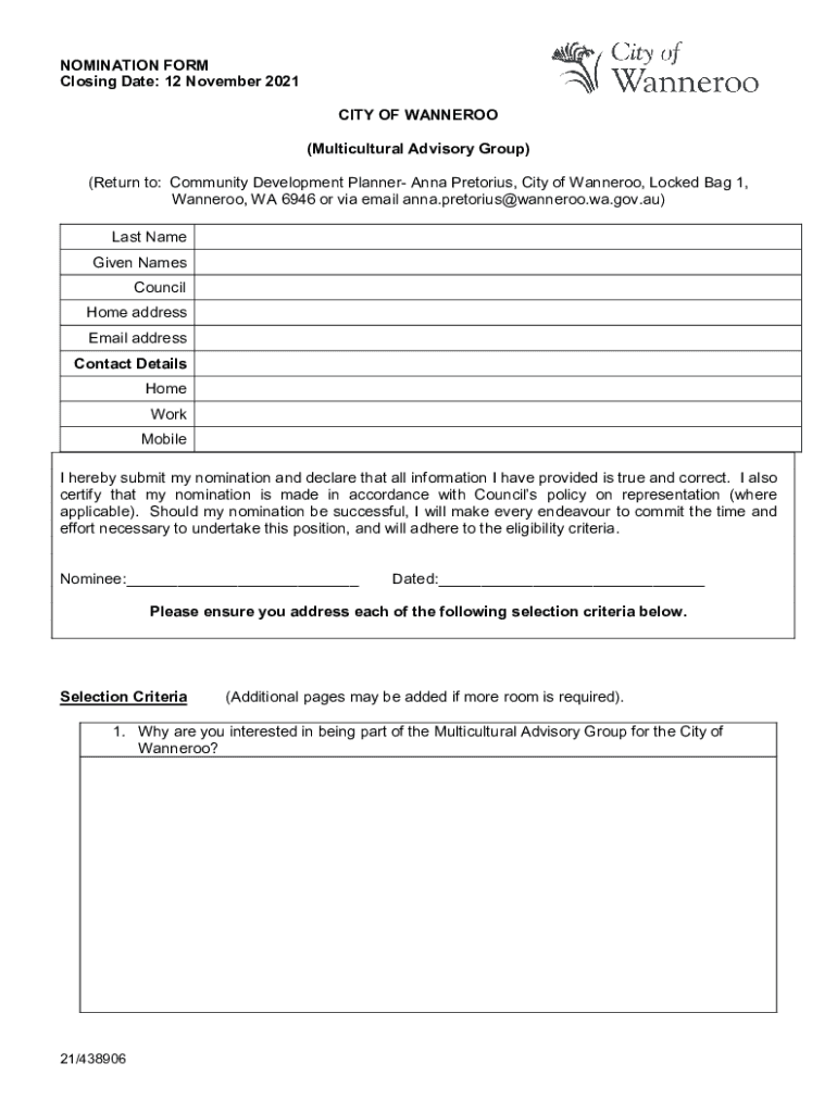 NOMINATION FORM Closing Date: 12 November 2021 CITY OF WANNEROO (Multicultural Advisory Group) (Return to: Community Development Planner Anna Pretorium, City of Tanneries, Locked Bag 1, Tanneries,