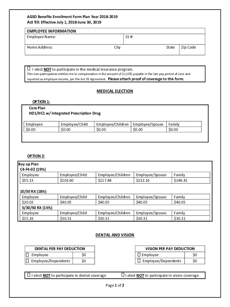 AGED Benefits Enrollment Form Plan Year 20182019 Act 93: Effective July 1, 2018June 30, 2019EMPLOYEE INFORMATION Employee Name:SS #:Home Address:CityStateZip Code elect NOT to participate in the medical