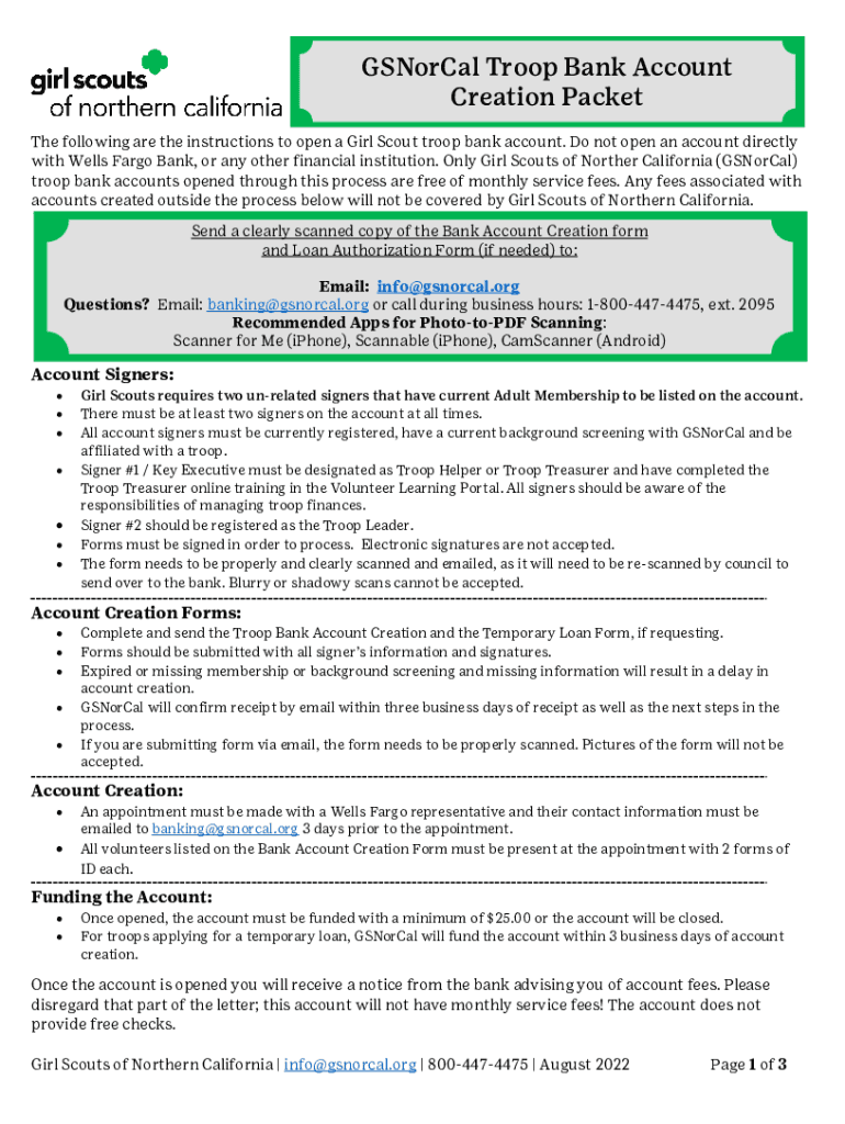 General Troop Bank Account Creation Packet The following are the instructions to open a Girl Scout troop bank account. Do not open an account directly with Wells Fargo Bank, or any other financial