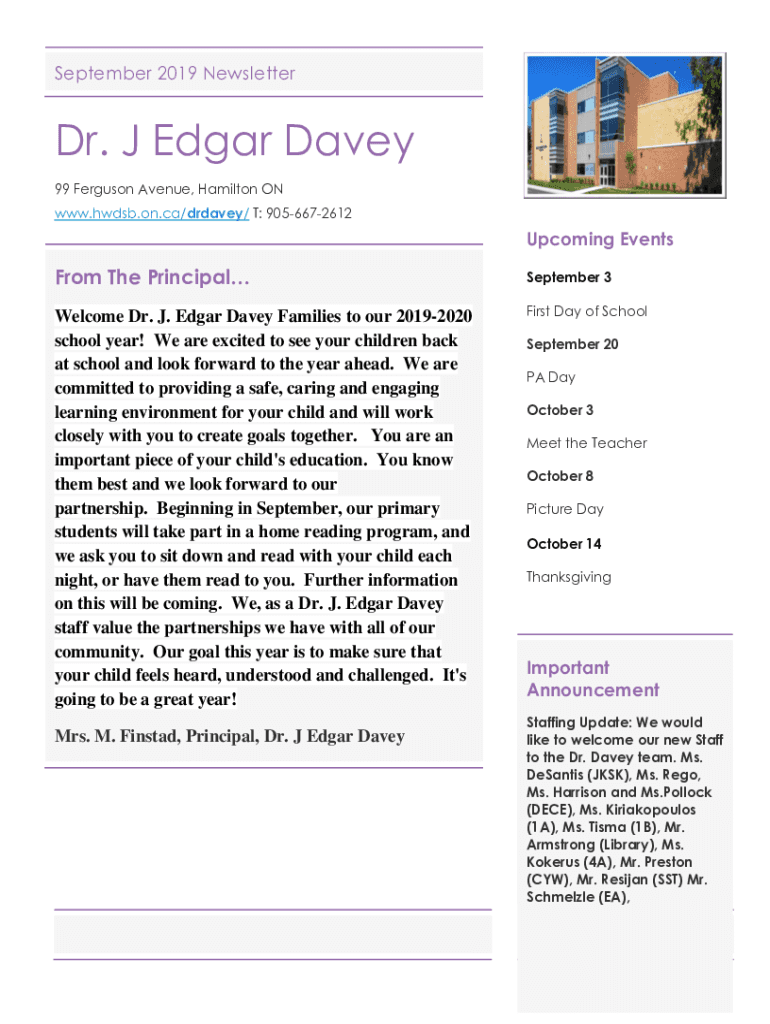 September 2019 Newsletter Dr. J Edgar Davey 99 Ferguson Avenue, Hamilton ON www.hwdsb.on.ca/drdavey/ T: 9056672612Upcoming EventsFrom The Principal Welcome Dr. J. Edgar Davey Families to our 20192020