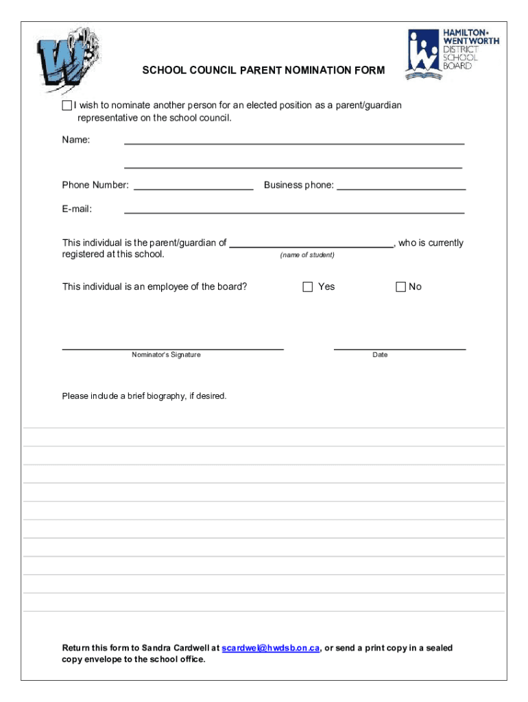 SCHOOL COUNCIL PARENT NOMINATION FORM I wish to nominate another person for an elected position as a parent/guardian representative on the school council. Name:Phone Number:Business phone:Email: This