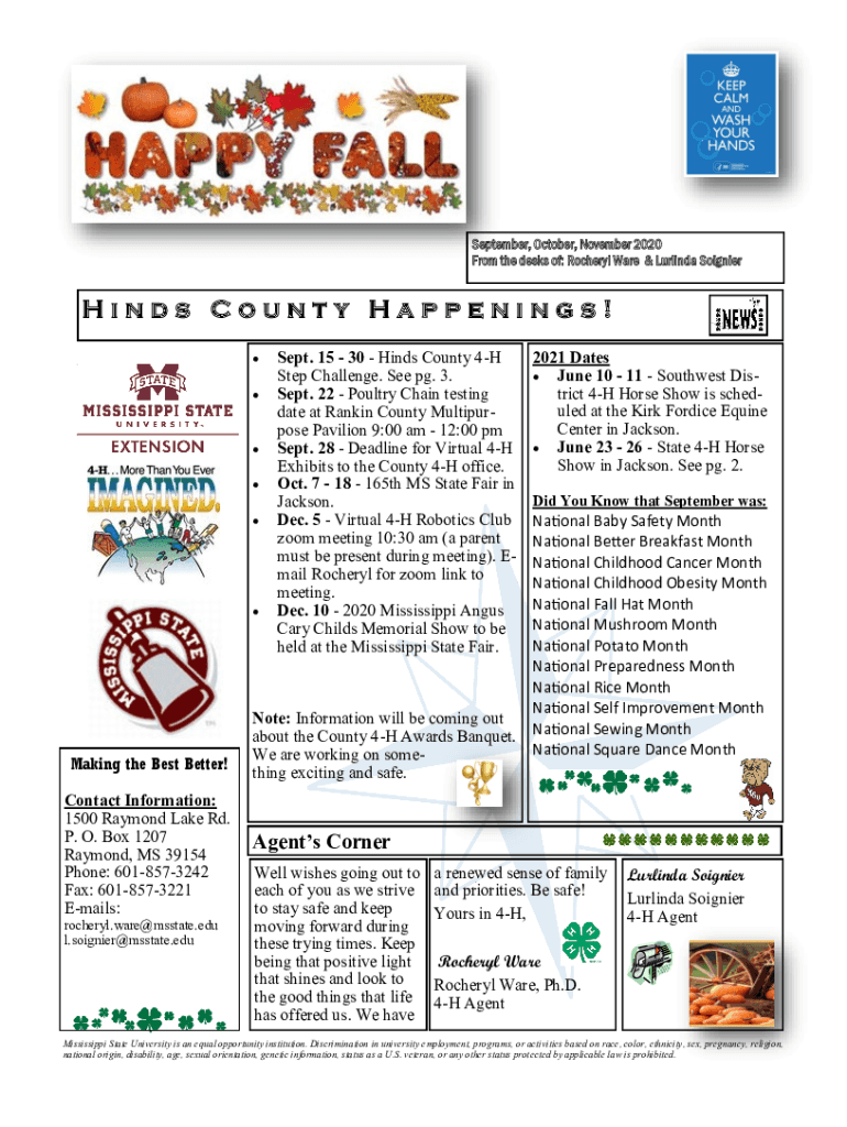 September, October, November 2020 From the desks of: Cheryl Ware & Lucinda SoignierHinds County Happenings! Making the Best Better! Contact Information: 1500 Raymond Lake Rd. P. O. Box 1207 Raymond,