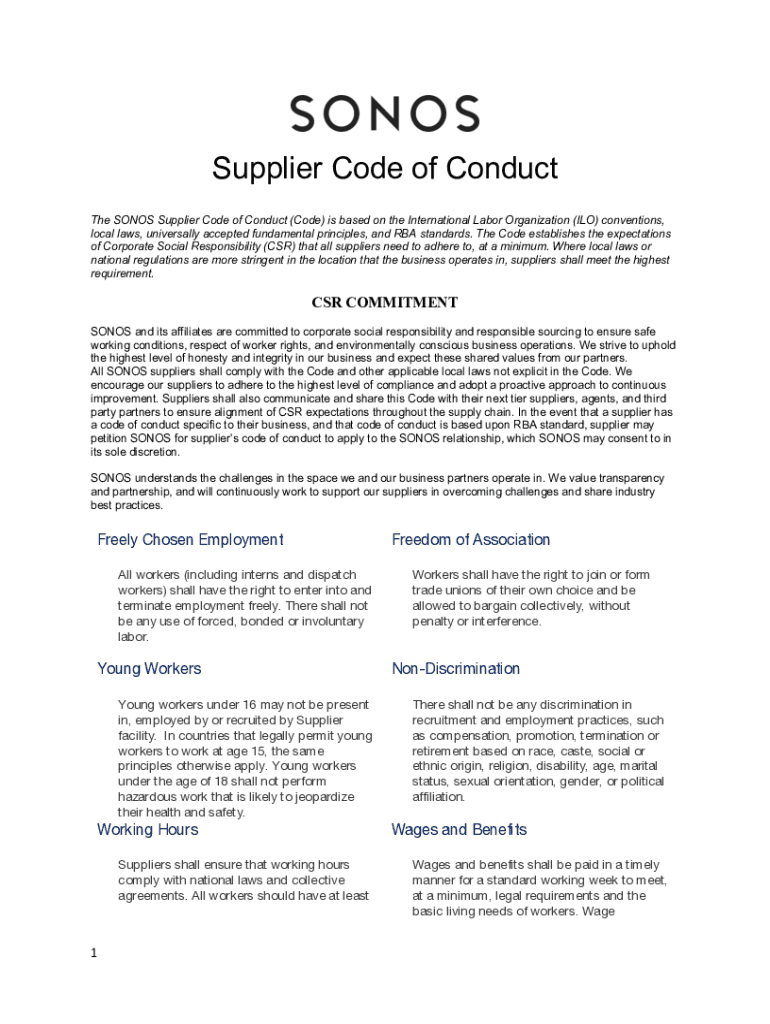 Supplier Code of Conduct The SONOS Supplier Code of Conduct (Code) is based on the International Labor Organization (ILL) conventions, local laws, universally accepted fundamental principles, and