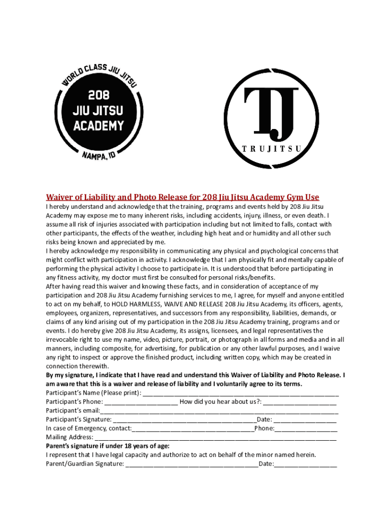 Waiver of Liability and Photo Release for 208 Jim Jitsi Academy Gym Use I hereby understand and acknowledge that the training, programs and events held by 208 Jim Jitsi Academy may expose me to many