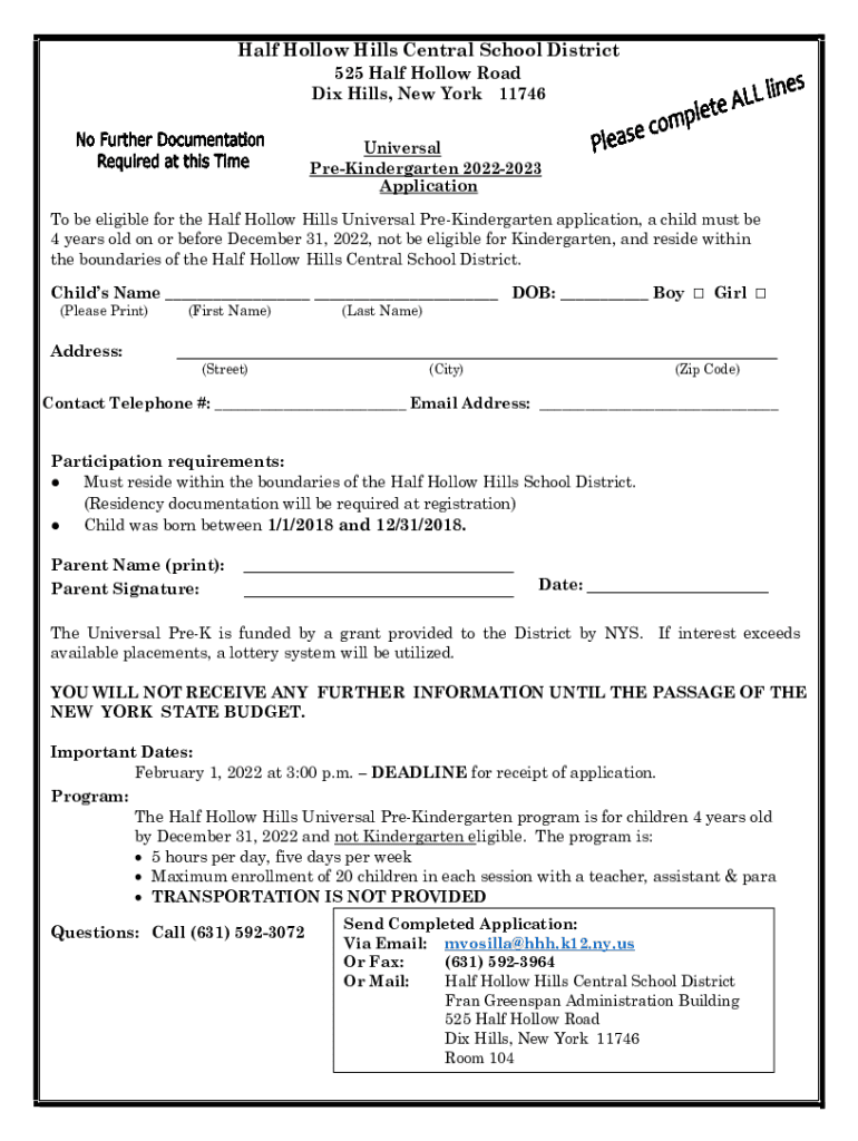 Half Hollow Hills Central School District 525 Half Hollow Road Dix Hills, New York 11746Universal PreKindergarten 20222023 Application To be eligible for the Half Hollow Hills Universal PreKindergarten