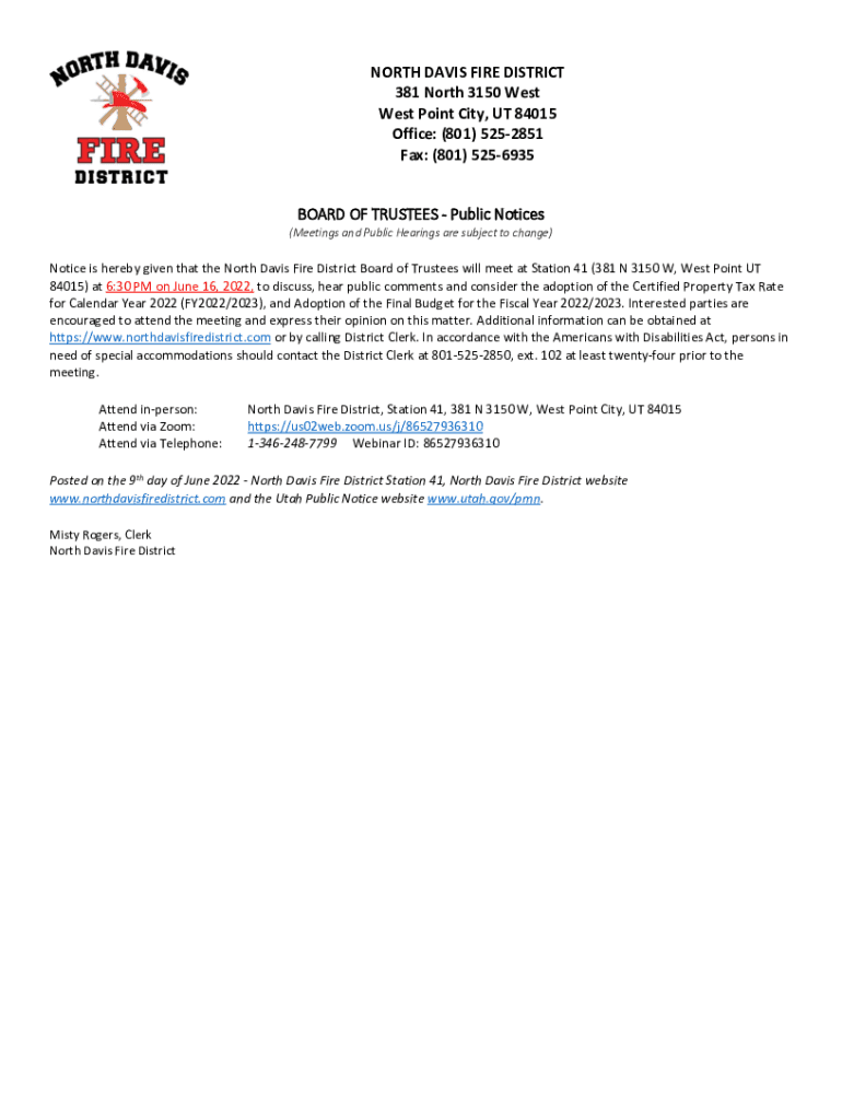 NORTH DAVIS FIRE DISTRICT 381 North 3150 West Point City, UT 84015 Office: (801) 5252851 Fax: (801) 5256935 BOARD OF TRUSTEES Public Notices (Meetings and Public Hearings are subject to change)Notice