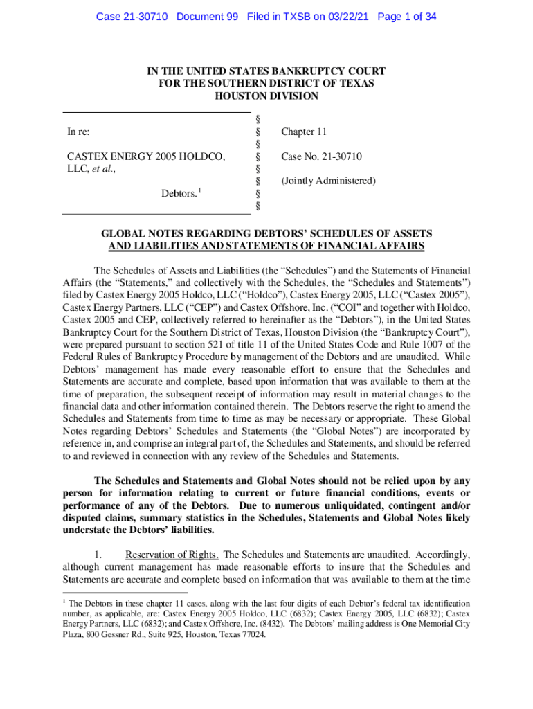 Case 2130710 Document 99 Filed in TSB on 03/22/21-Page 1 of 34IN THE UNITED STATES BANKRUPTCY COURT FOR THE SOUTHERN DISTRICT OF TEXAS HOUSTON DIVISION In re: CASTE ENERGY 2005 HOL DCO, LLC, et al.,
