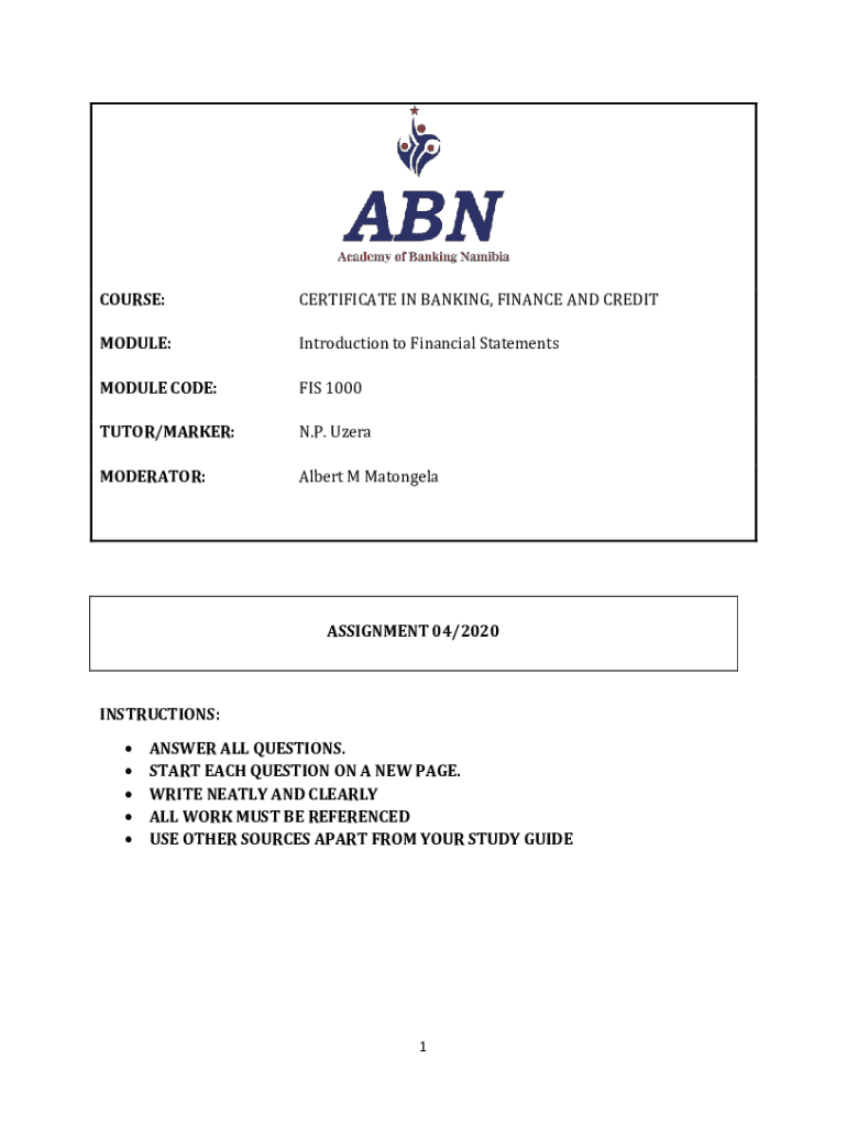 COURSE:CERTIFICATE IN BANKING, FINANCE AND CREDITMODULE:Introduction to Financial StatementsMODULE CODE:IS 1000TUTOR/MARKER:N.P. UzeraMODERATOR:Albert M MatongelaASSIGNMENT 04/2020INSTRUCTIONS: ANSWER