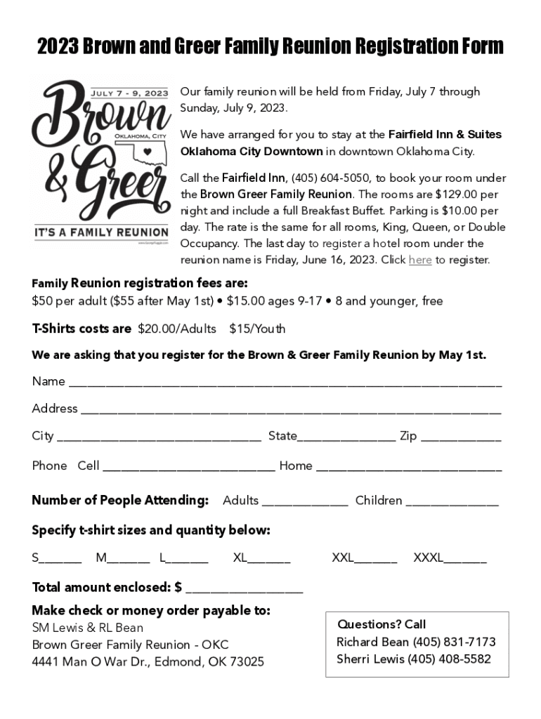 2023 Brown and Greer Family Reunion Registration Former family reunion will be held from Friday, July 7 through Sunday, July 9, 2023. We have arranged for you to stay at the Fairfield Inn & Suites