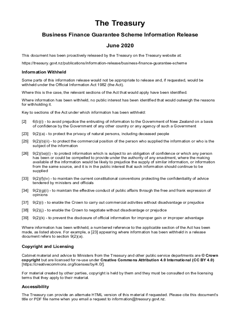 The Treasury Business Finance Guarantee Scheme Information Release June 2020 This document has been proactively released by the Treasury on the Treasury website at: https://treasury.govt.nz/publications/informationrelease/businessfinanceguaranteeschemeInformation