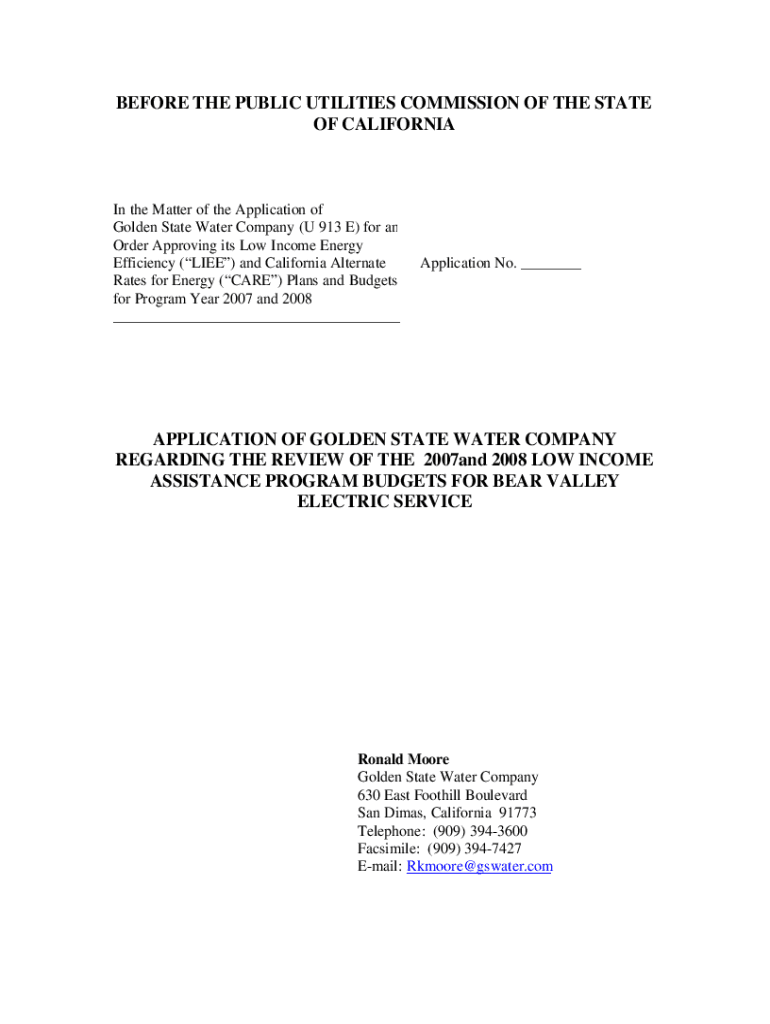 BEFORE THE PUBLIC UTILITIES COMMISSION OF THE STATE OF Californian the Matter of the Application of Golden State Water Company (U 913 E) for an Order Approving its Low Income Energy Efficiency (LIFE)