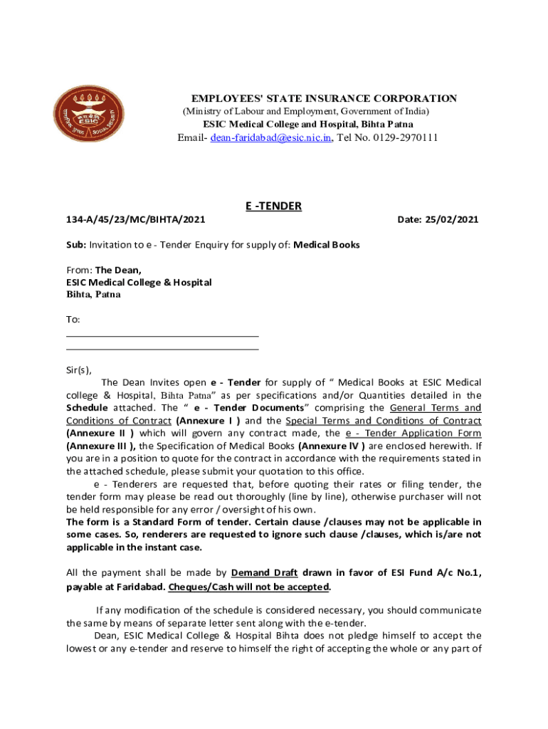 Vendors and suppliers who wish to participate in ESIC tenders are required to file e-tender - esic.