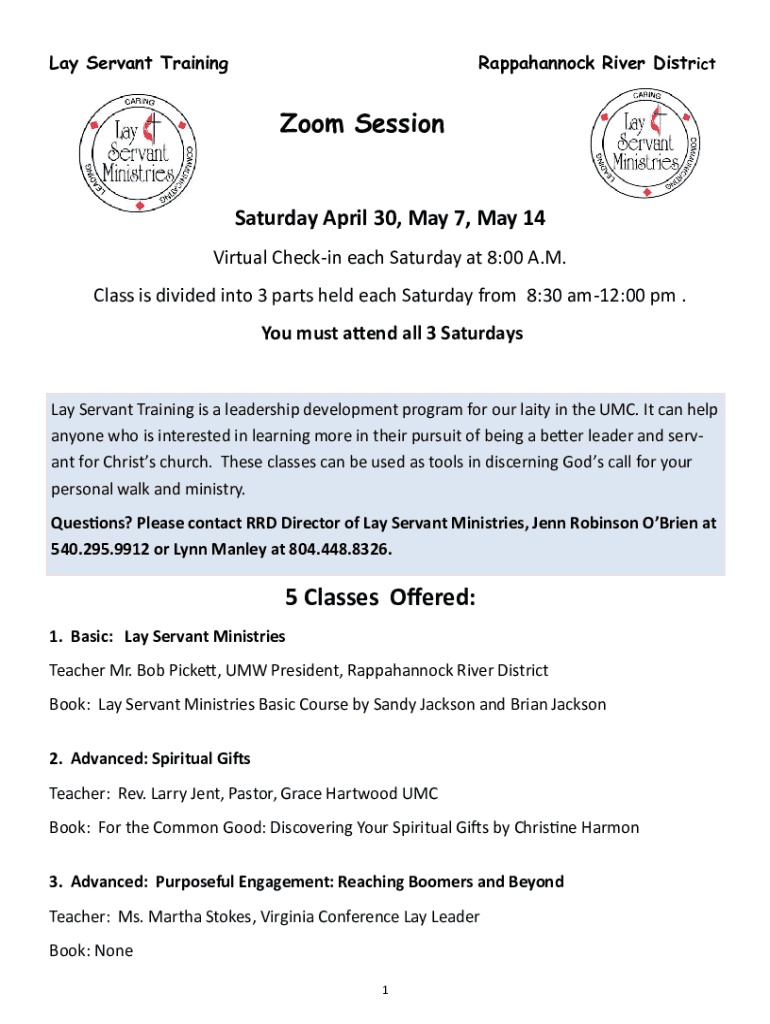 Lay Servant TrainingRappahannock River DistrictZoom Session Saturday, April 30, May 7, May 14