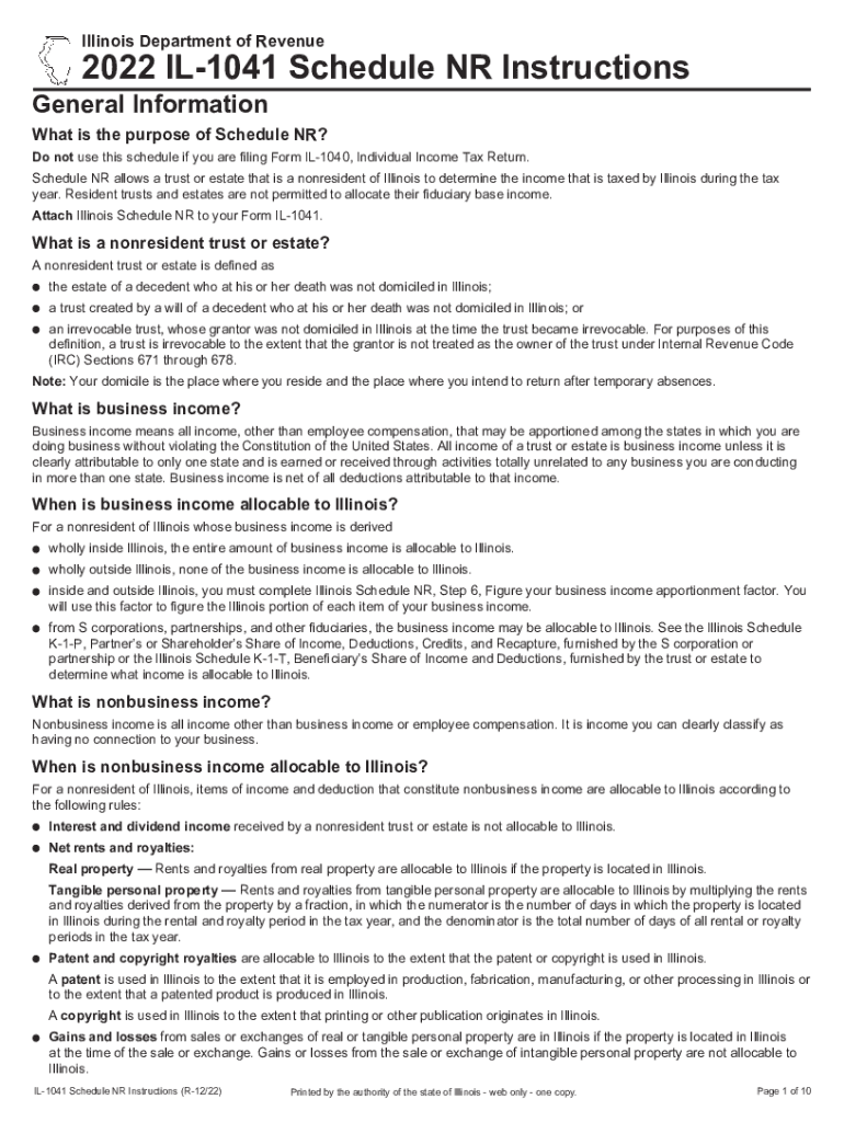 Illinois Department of Revenue2022 IL1041 Schedule NR InstructionsGeneral Informational is the purpose of Schedule NR? Do not use this schedule if you are filing Form IL1040, Individual Income Tax