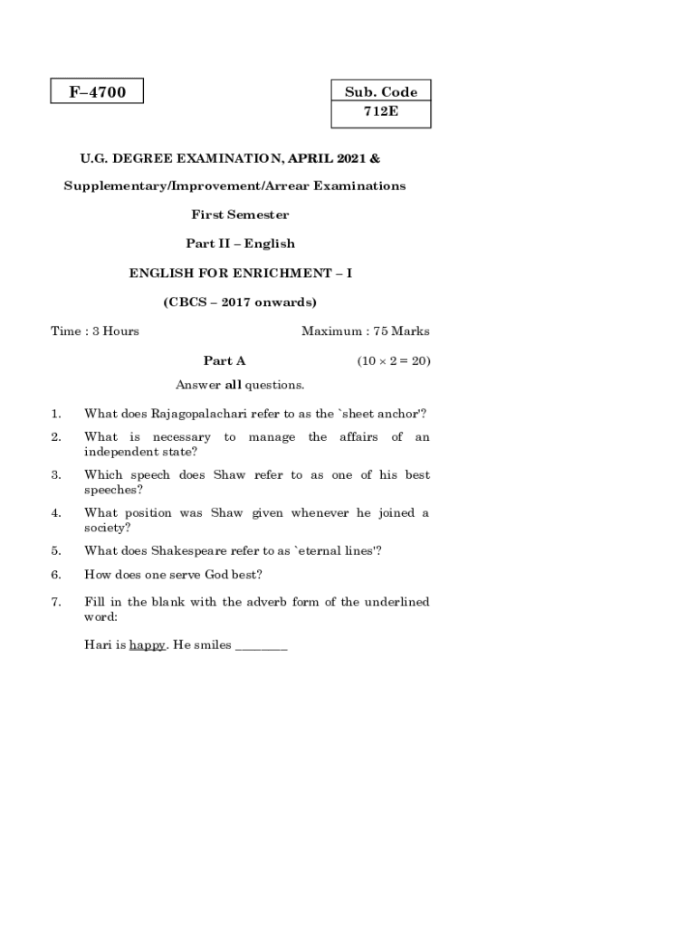F4700Sub. Code 712EU. G. DEGREE EXAMINATION, APRIL 2021 & Supplementary/Improvement/Carrier Examinations First Semester Part II English FOR ENRICHMENT I (CBC 2017 onwards) Time : 3 HoursMaximum :