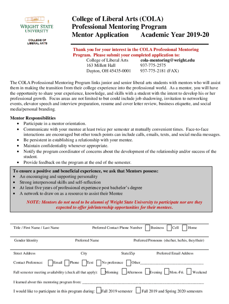 College of Liberal Arts (COLA) Professional Mentoring Program Mentor Application Academic Year 201920 Thank you for your interest in the COLA Professional Mentoring Program. Please submit your completed