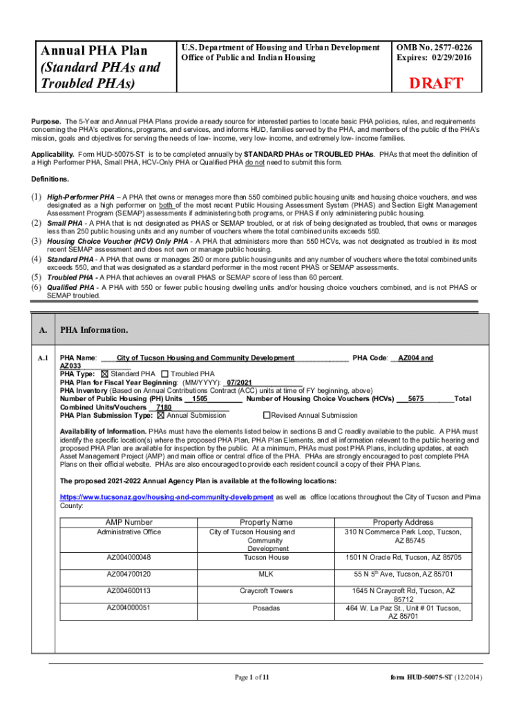 Annual PHA Plan (Standard Has and Troubled Has)U.S. Department of Housing and Urban Development Office of Public and Indian Housing OMB No. 25770226 Expires: 02/29/2016DRAFTPurpose. The 5Year and