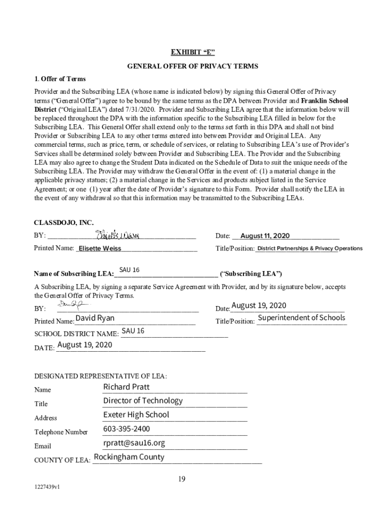 EXHIBIT E GENERAL OFFER OF PRIVACY TERMS 1. Offer of Terms Provider and the Subscribing LEA (whose name is indicated below) by signing this General Offer of Privacy terms (General Offer) agree to