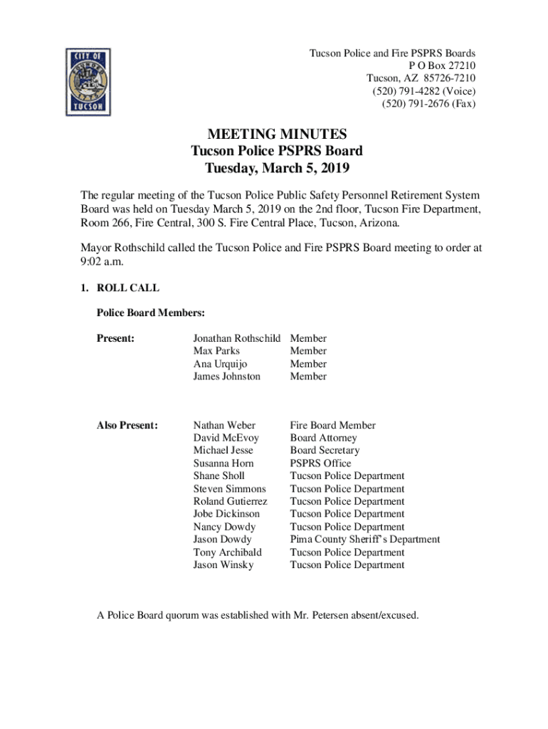 Tucson Police and Fire PS PRS Boards P O Box 27210 Tucson, AZ 857267210 (520) 7914282 (Voice) (520) 7912676 (Fax)MEETING MINUTES Tucson Police PS PRS Board Tuesday, March 5, 2019, The regular meeting