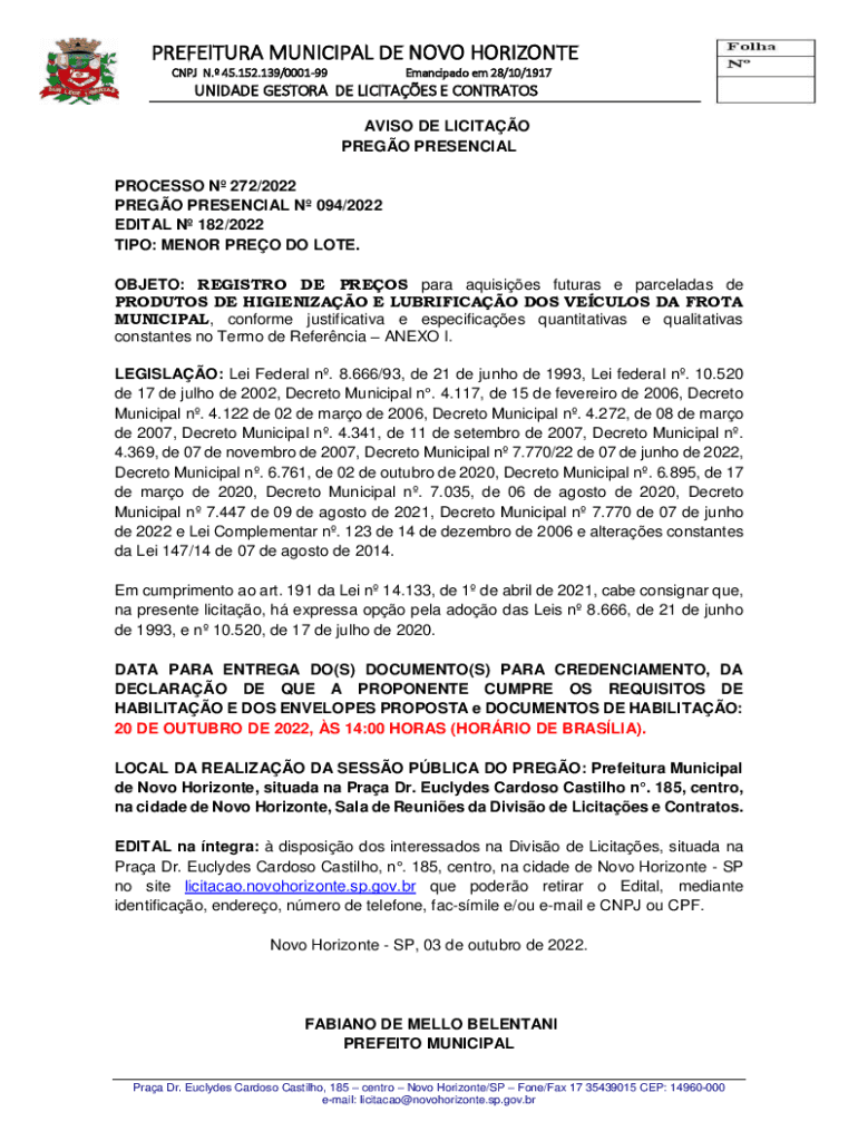 PREFECTURE MUNICIPAL DE NOVA HORIZONTAL CNJ N. 45.152.139/000199Emancipado em 28/10/1917UNIDADE RESTORE DE LICIT AES E CONTRALTOS AVIS ODE LICIT AO PRESO PRESENCE PROCESS N 272/2022 PRESO PRESENCE