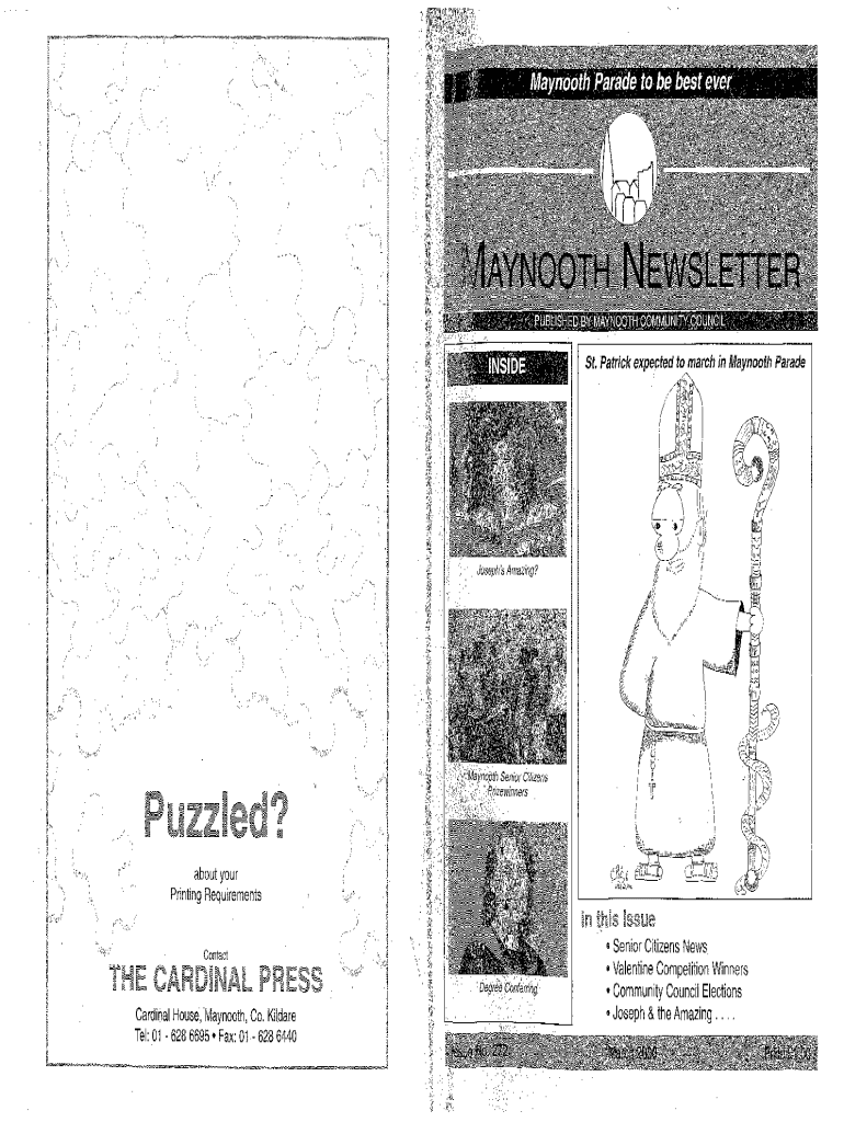 St. Patrick expected to march in Mammoth Parade about your Printing RequirementsContactI Cardinal House, Mammoth, Co. Kildare Tel:.o1 628 6695 Fax: 01 628 6440 Senior Citizens News Valentine Competition