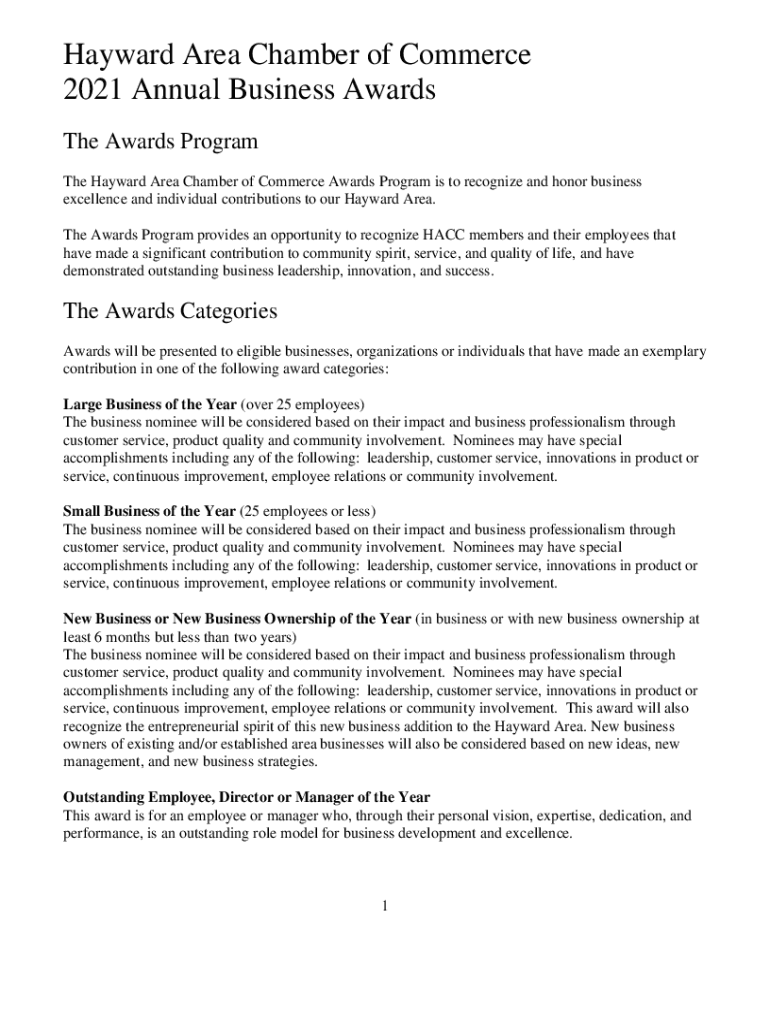 Hayward Area Chamber of Commerce 2021 Annual Business Awards The Awards Program The Hayward Area Chamber of Commerce Awards Program is to recognize and honor business excellence and individual contributions