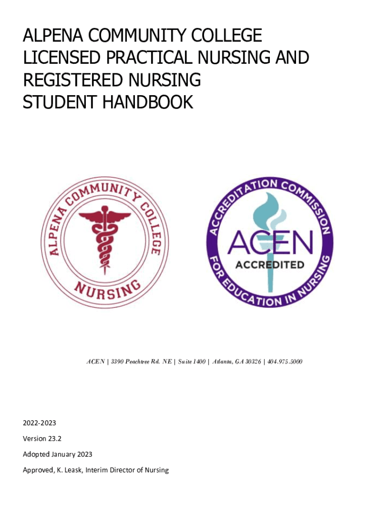 ALENA COMMUNITY COLLEGE LICENSED PRACTICAL NURSING AND REGISTERED NURSING STUDENT HANDBOOKACEN | 3390 Peach tree Rd. NE | Suite 1400 | Atlanta, GA 30326 | 404.975.500020222023 Version 23.2 Adopted