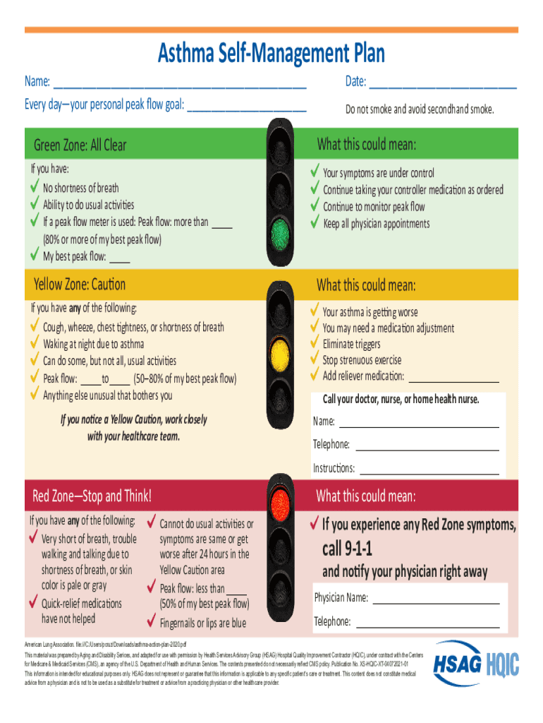 Asthma Self-management Planned: ___ Every day your personal peak flow goal: ___Date: ___Do not smoke and avoid secondhand smoke. What this could mean:Green Zone: All Clear If you have: No shortness