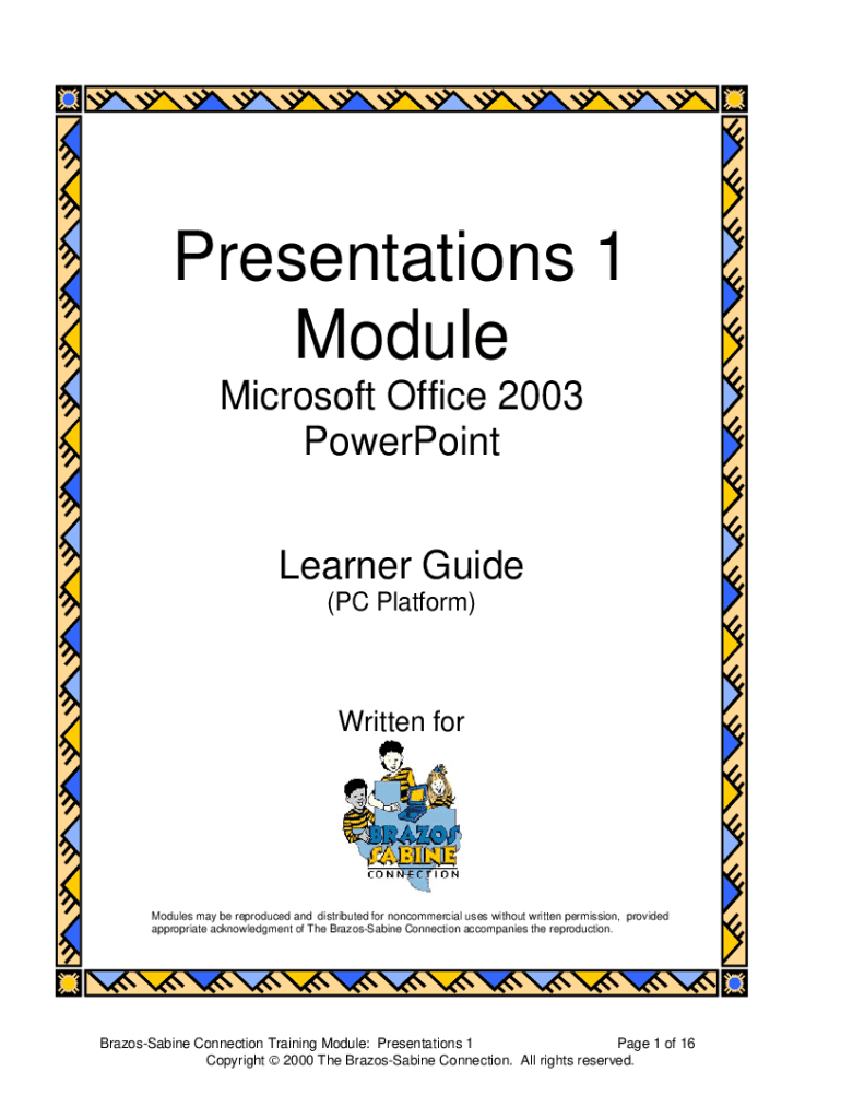 Presentations 1 Module Microsoft Office 2003 PowerPoint Learner Guide (PC Platform)Written modules may be reproduced and distributed for noncommercial uses without written permission, provided appropriate