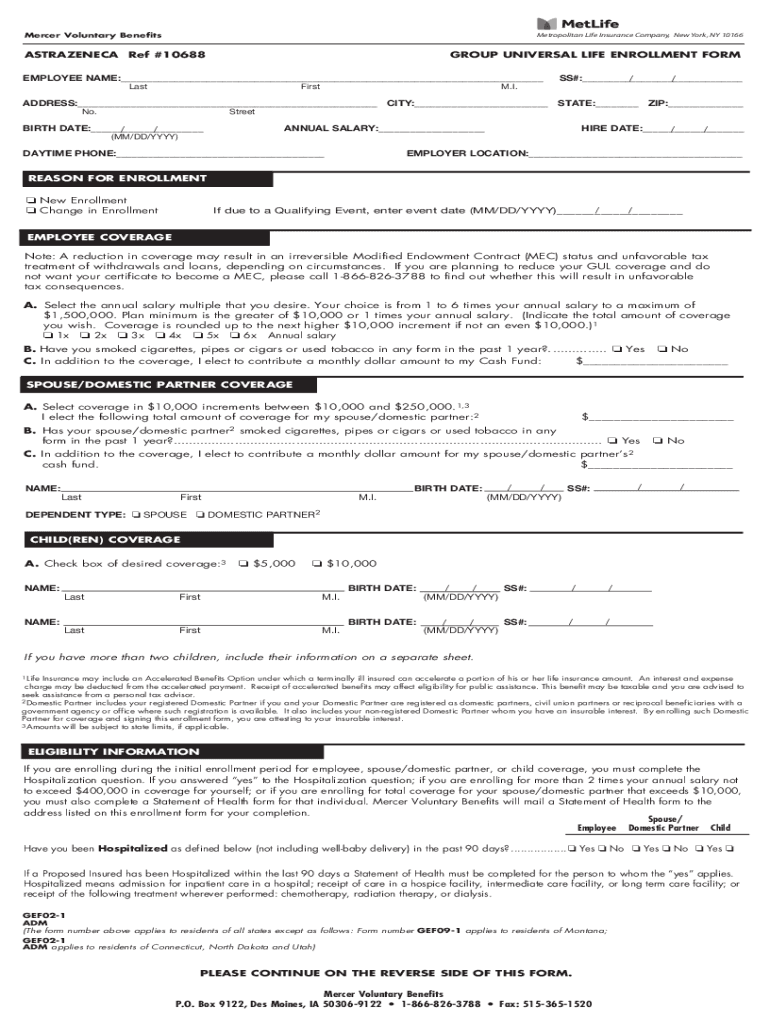 Mercer Voluntary BenefitsMetropolitan Life Insurance Company, New York, NY 10166ASTRAZENECA Ref #10688GROUP UNIVERSAL LIFE ENROLLMENT FORMEMPLOYEE NAME:___ LastFirstM. I.SS#:___ / /ADDRESS:___ CITY:___