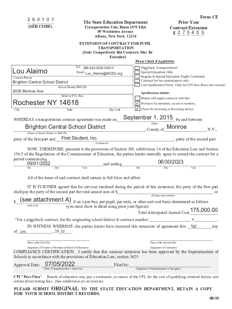 Form CE1 0 10 __ __ __ 6 __ 2 __ __The State Education Department(USED CODE)Prior Year Contract/Extension 2 __ 4 __ 7 __ 5 5 __ 0 __ E __Transportation Unit, Room EBA :DVKLQWRQ$YHQXH Albany, New York