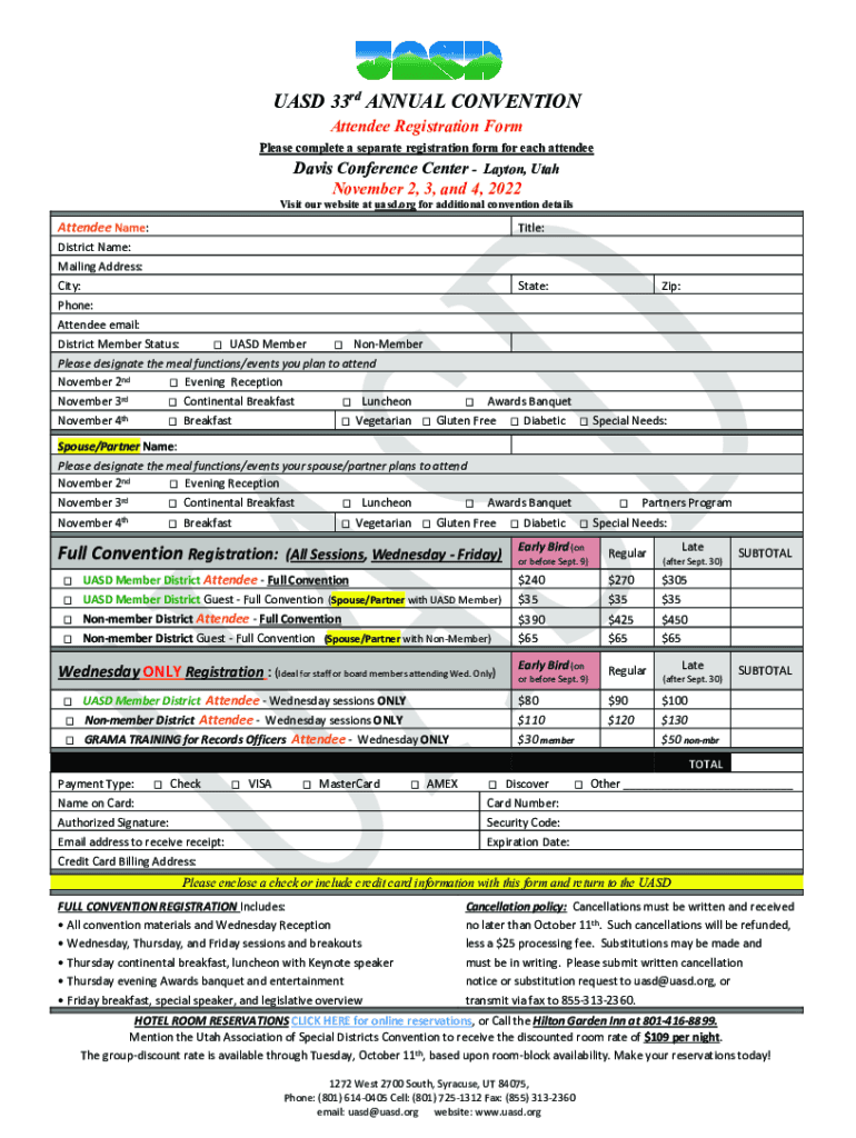 ASD 33rd ANNUAL CONVENTION Attendee Registration Form Please complete a separate registration form for each attendee Davis Conference Center Layton, Utah November 2, 3, and 4, 2022 Visit our website