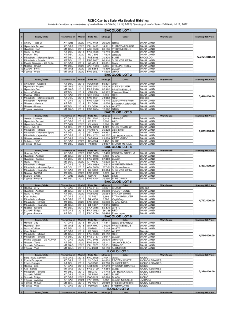 CBC Car Lot Sale Via Sealed Bidding Batch 4: Deadline of submission of sealed bids 5:00 PM; Jul 18, 2022| Opening of sealed bids 2:00 PM; Jul 19, 2022BACOLOD LOT 1 #Brand/Make1 Cherry Tiago 2 2 Hyundai