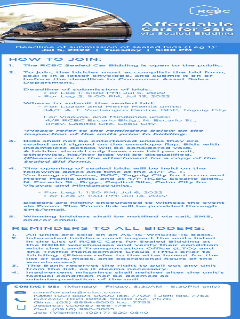 CBC Cars for Sealed Bidding For inquiries, you may contact us from Monday to Friday, 8:30 AM to 5:30 PM through:Schedule of sealed bidding: 1st Sealed Bidding: Deadline of submission of bid: 5:00