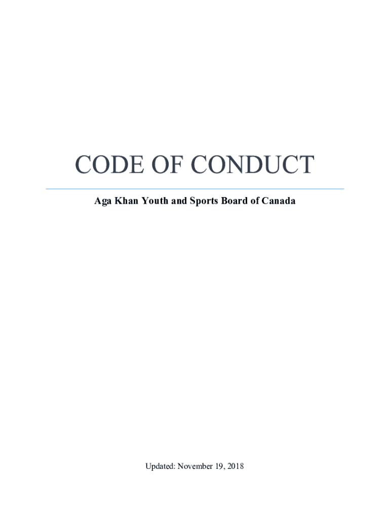 Aga Khan Youth and Sports Board of CanadaUpdated: November 19, 2018Aga Khan Youth and Sports Board of CanadaUpdated: November 19, 2018CODE OF Conductible of Contents PREAMBLE I.AKY SB OBJECTIVE SII.WHO
