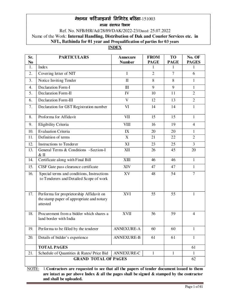 , 151003 Refs. No. NFL/HR/Ad/28/89/DAK/202223/Dated: 25.07.2022 Name of the Work: Internal Handling, Distribution of DAK and Courier Services etc. in NFL, Bathing for 01 year and Prequalification
