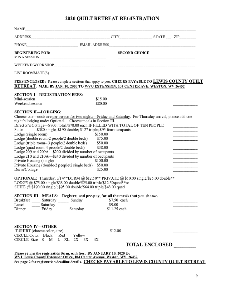 2020 QUILT RETREAT REGISTRATION NAME___ ADDRESS___ CITY___ STATE ___ ZIP___ PHONE___ EMAIL ADDRESS___ REGISTERING FOR: MINI SESSION___SECOND CHOICE ___WEEKEND WORKSHOP______LIST ROOMMATE(S)___ FEES