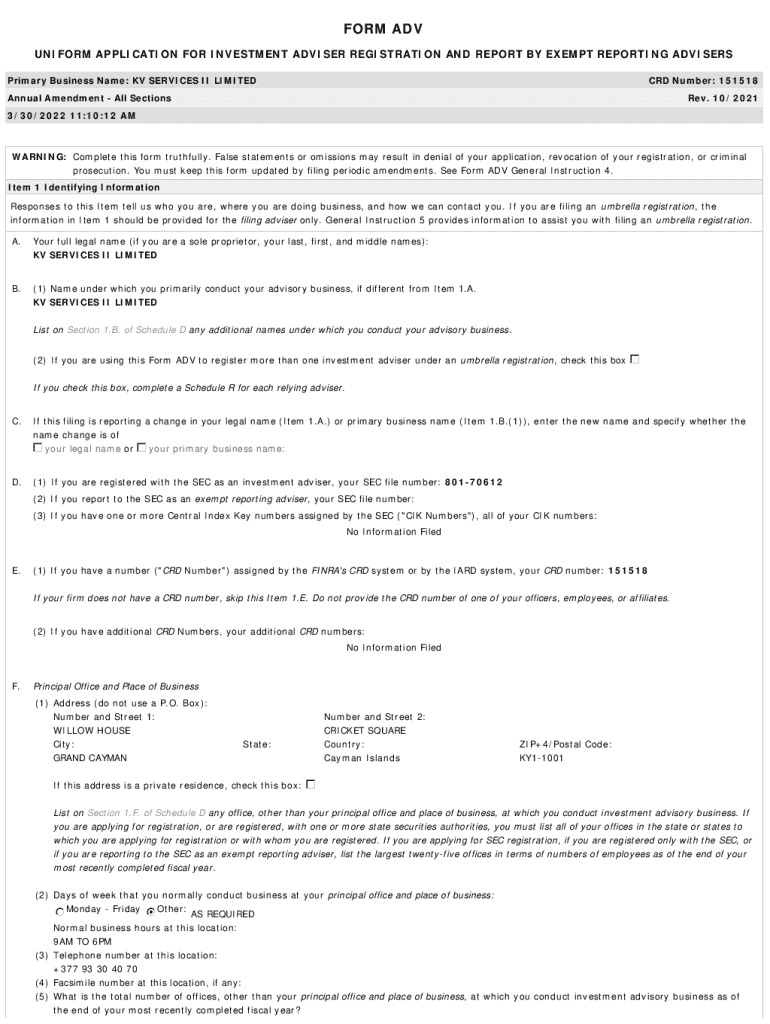 FORM ADV UNIFORM APPLICATION FOR INVESTMENT ADVISER REGISTRATION AND REPORT BY EXEMPT REPORTING ADVISERS Primary Business Name: KV SERVICES II LIMITED CRD Number: 151518Annual Amendment All Sections