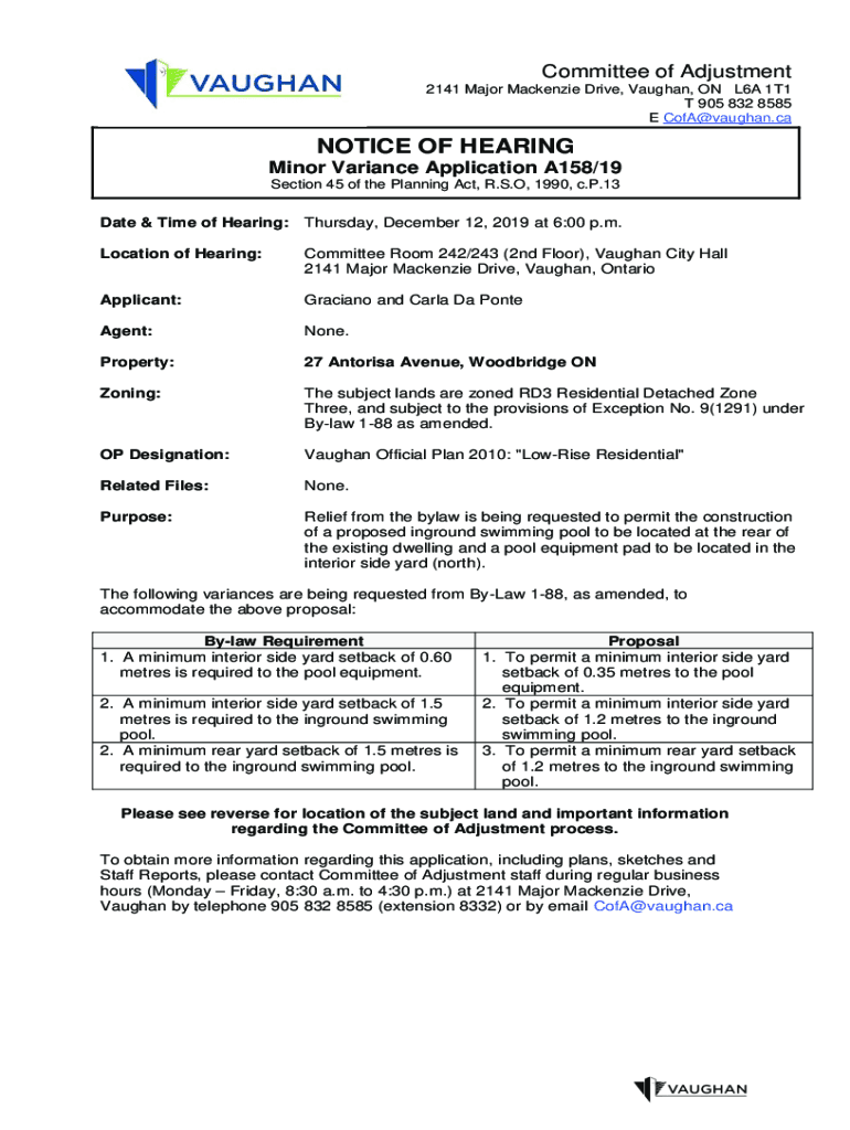 Committee of Adjustment 2141 Major Mackenzie Drive, Vaughan, ON L6A 1T1 T 905 832 8585 E CofA@vaughan.caNOTICE OF HEARING Minor Variance Application A158/19 Section 45 of the Planning Act, R.S.O,