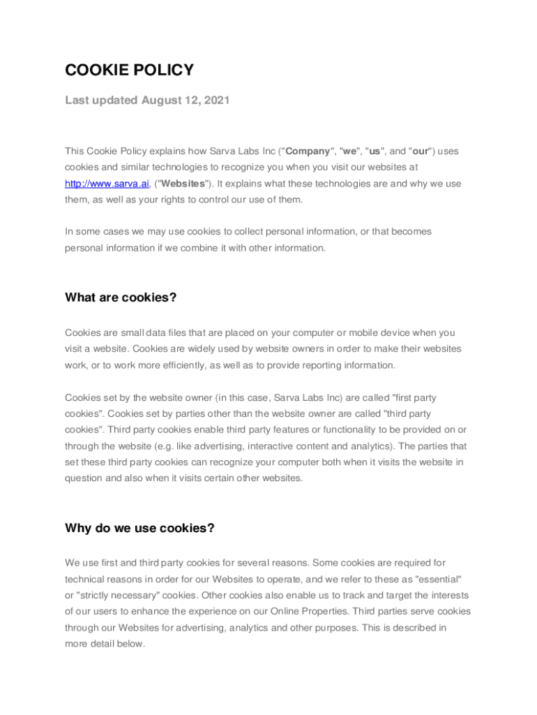 COOKIE POLICY Last updated August 12, 2021This Cookie Policy explains how Sara Labs Inc (\” Company\”, \” we\”, \” us\”, and \” our\”) uses cookies and similar technologies to recognize