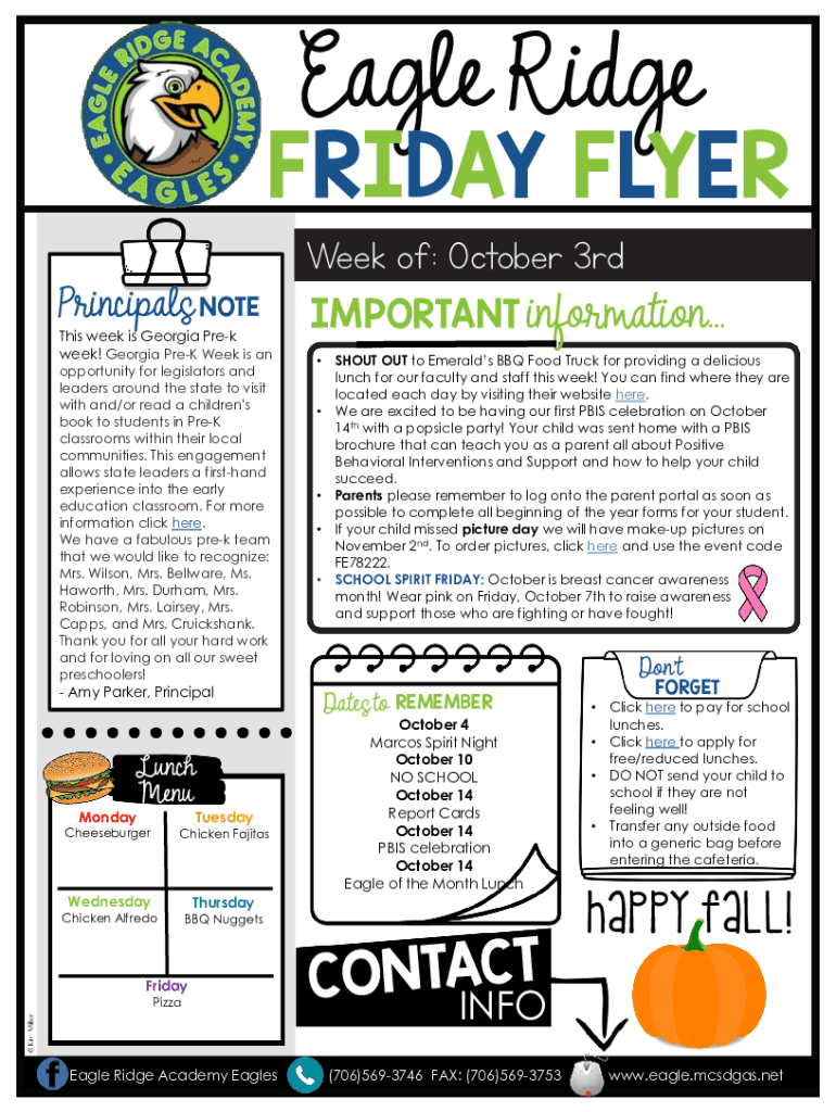 Eagle mid-Friday FLYER Principals Notes week is Georgia Prey week! Georgia Prey Week is an opportunity for legislators and leaders around the state to visit with and/or read a child\'s book to students