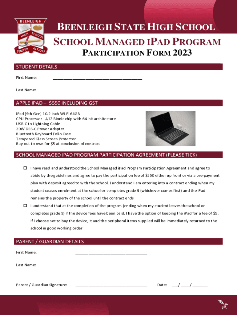 BOBSLEIGH STATE HIGH SCHOOL MANAGED iPad PROGRAM PARTICIPATION FORM 2023 STUDENT DETAILS First Name:___Last Name:___APPLE iPad $550 INCLUDING GST iPad (9th Gen) 10.2 inch Wi-Fi 64 GB CPU Processor
