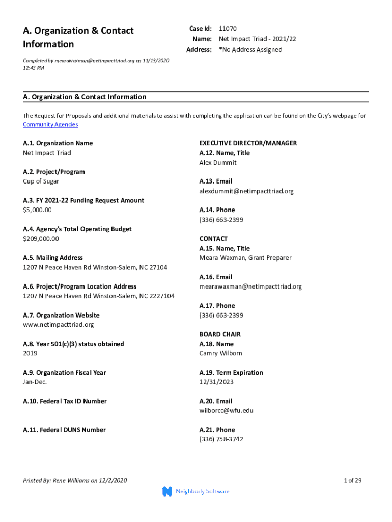 A. Organization & Contact Information Case I'd: 11070 Name: Net Impact Triad 2021/22 Address: *No Address AssignedCompleted by mearawaxman@netimpacttriad.org on 11/13/2020 12:43 PMA. Organization