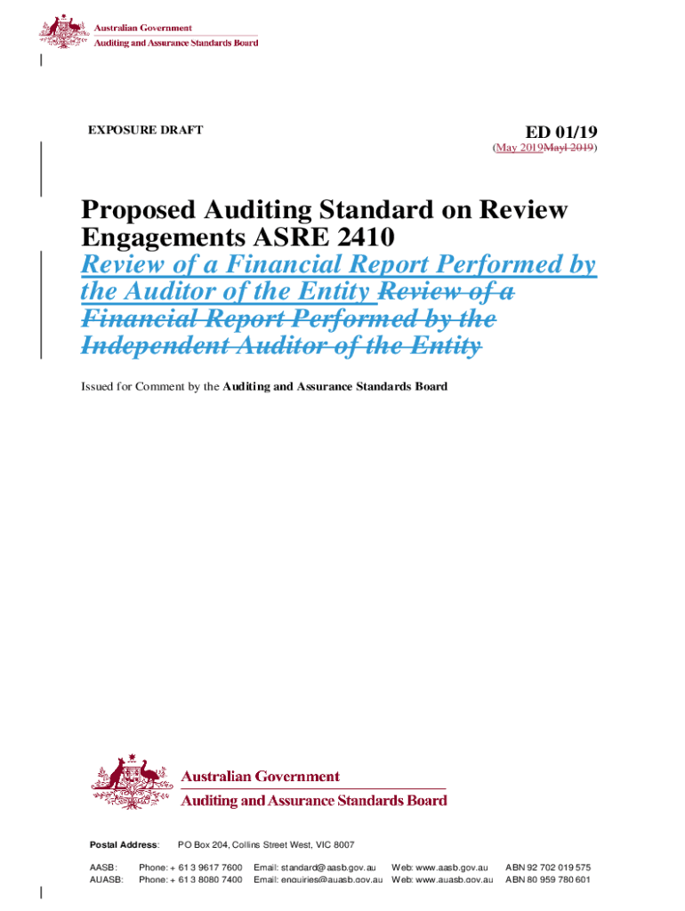 EXPOSURE DRAFTED 01/19 (May 2019Mayl 2019)Proposed Auditing Standard on Review Engagements ARE 2410 Review of a Financial Report Performed by the Auditor of the Entity Review of a Financial Report