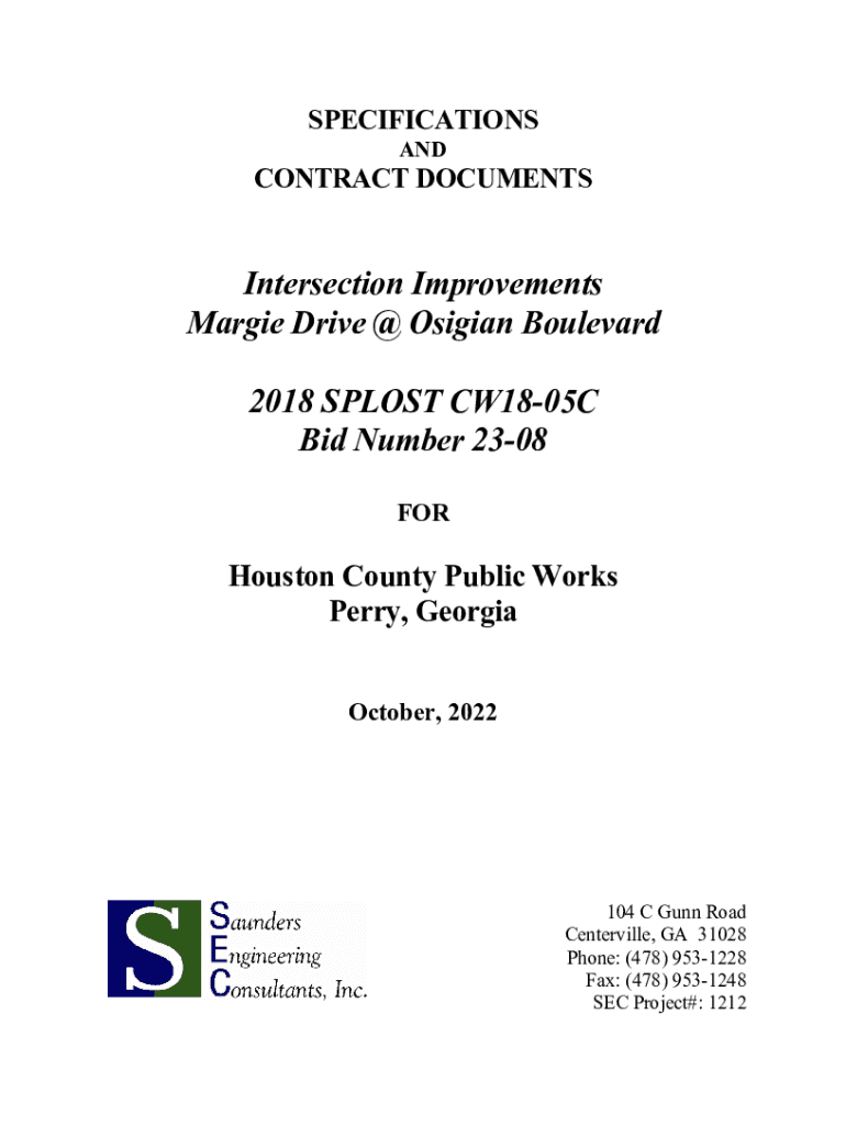 SPECIFICATIONS CONTRACT DOCUMENTSIntersection Improvements Margie Drive @ Origin Boulevard 2018 SPLOSH CW1805C Bid Number 2308 FOR Houston County Public Works Perry, Georgia October 2022104 C Gun