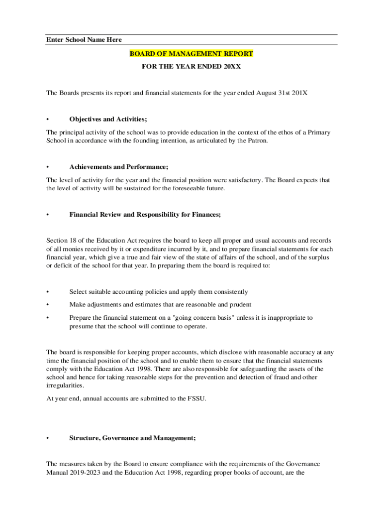 Enter School Name Here BOARD OF MANAGEMENT REPORT FOR THE YEAR ENDED 20XXThe Boards presents its report and financial statements for the year ended August 31st 201XObjectives and Activities;The principal