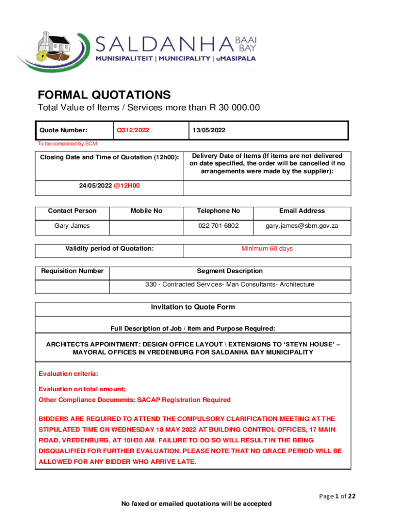 FORMAL QUOTATIONS Total Value of Items / Services more than R 30 000.00 Quote Number:Q312/202213/05/2022To be completed by Closing Date and Time of Quotation (12h00):Delivery Date of Items (If items