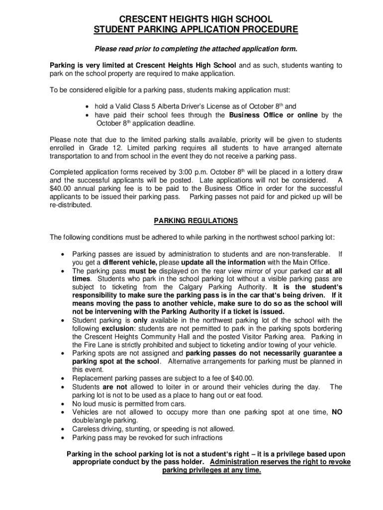 CRESCENT HEIGHTS HIGH SCHOOL STUDENT PARKING APPLICATION PROCEDURE Please read prior to completing the attached application form. Parking is very limited at Crescent Heights High School and as such,