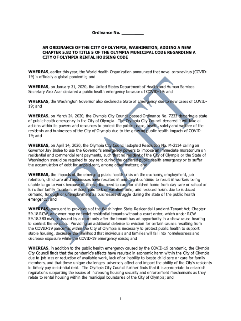 Ordinance No.___AN ORDINANCE OF THE CITY OF OLYMPIA, WASHINGTON, ADDING A NEW CHAPTER 5.82 TO TITLE 5 OF THE OLYMPIA MUNICIPAL CODE REGARDING A CITY OF OLYMPIA RENTAL HOUSING CODE WHEREAS, earlier